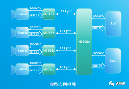 锐泰微基于自研C³ Lync SerDes技术推出针对汽车高清摄像头传输的SerDes套片产品,可支持18Mega@30fps摄像头图像传输,M66S6x系列为单串行链路通道串行器,M65Q6x为四串行链路接收通道解串器。